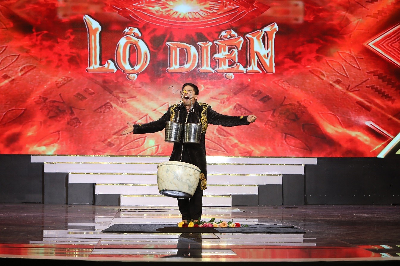 Quả thật là một thử thách cam go nhưng Tuấn Joker rất tự tin, anh đưa từng “vật thể” vào các bộ phận trên cơ thể của mình như mắt, mũi, họng và cổ, tiếp đến là nâng kèm hai xô nước, chum sứ trên những “vật thể” đó.